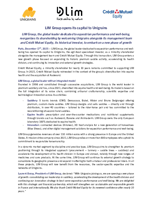 Partner finanziario e strategico dei dirigenti da oltre 60 anni, Unigrains ha apportato la sua esperienza e il suo valore aggiunto a oltre 1.000 aziende e gestisce oggi 964 milioni di euro.