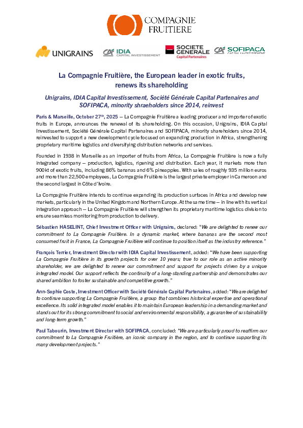 Unigrains Italia interviene in qualità di investitore settoriale, responsabile e di lungo termine nel capitale di piccole e medie imprese italiane dell’agroalimentare valutate tra 30 e 150 mln € con singoli ticket di investimento compresi tra 5 e 25 mln € come quota di partecipazione finale. La sua ambizione è di investire da 80 a 100 mln €, direttamente e tramite azioni, in una decina di aziende di tutta la catena del valore agroalimentare, al fine di accompagnare i loro progetti di sviluppo attraverso la crescita esterna/organica, l’internazionalizzazione o le transizioni azionarie, sempre a stretto contatto con i loro dirigenti.